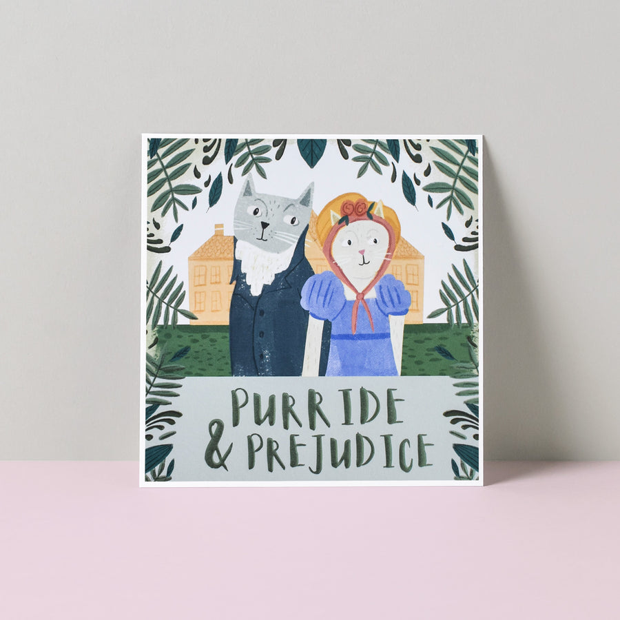 The 'Book Cats' card is a feline interpretation of the classic novel, Pride and Prejudice now reimagined as 'Purride and Prejudice’