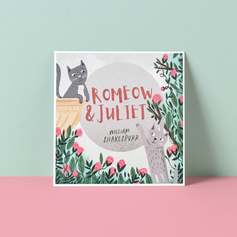The 'Book Cats' card is a feline interpretation of the classic novel Romeo and Juliet, now reimagined as 'Romeow and Juliet.’