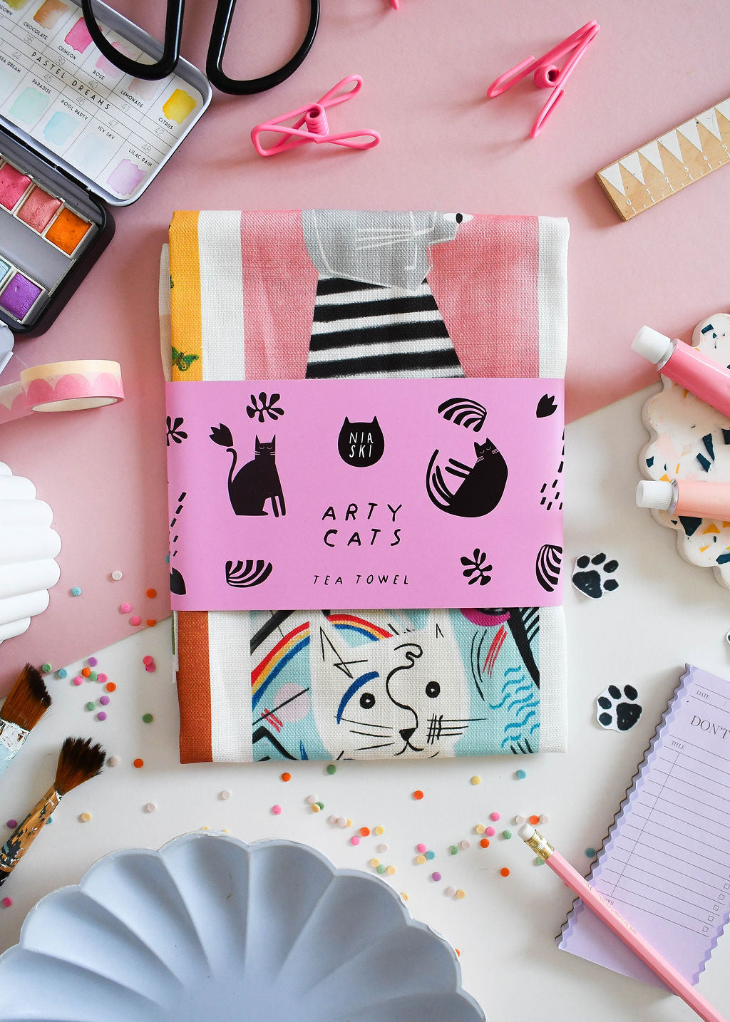 The 'Arty Cats' tea towel features 12 feline twists on famous and iconic artists.