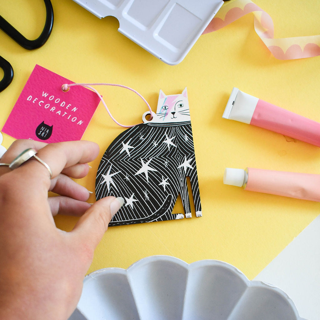 Wooden artist inspired cat decoration, made from sustainably sourced plywood.