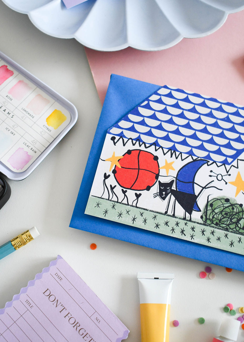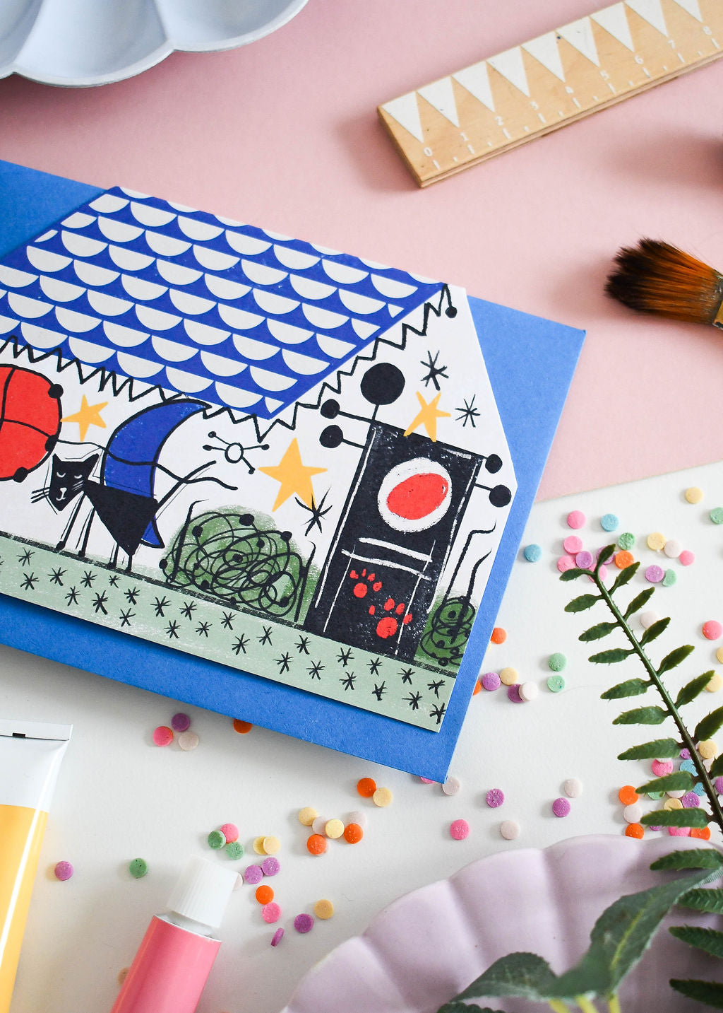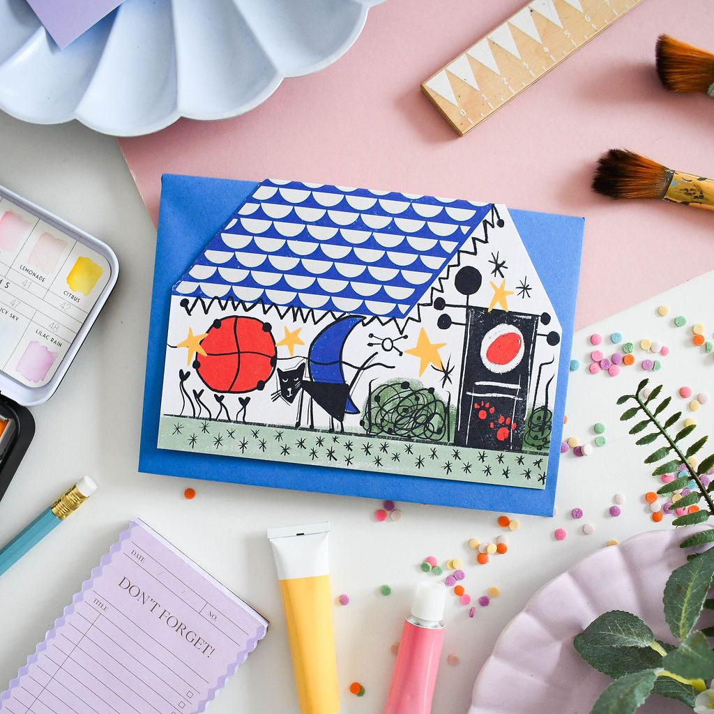 The ‘Nine Lives’ card is a feline interpretation of the art legend ‘Joan Miro’ now reimagined as ‘Meowro’ A unique cut out house shape card with a top edge tent fold. Combining a love of cats and a passion for art, illustrator and designer Nia Gould (‘Niaski’) has created a punny card range celebrating the life and times of artistic felines.